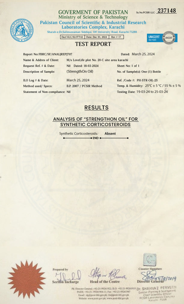 StrengthOn Oil has been tested by PCSIR (Pakistan Council of Scientific & Industrial Research) and verified to be free from synthetic corticosteroids and harmful chemicals. Each batch meets the highest national quality and safety standards.